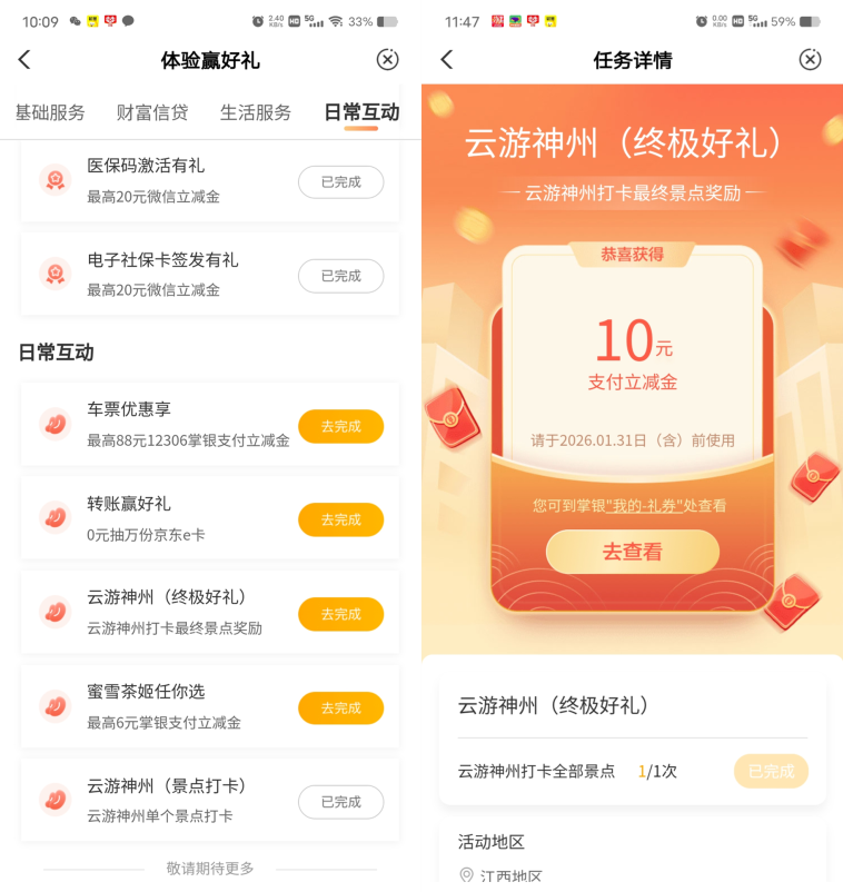 打开“中国农业银行”APP搜索【体验赢好礼】进去,下拉页面找到【云游神州】进去,每天完成简单的打卡,每到一个景点都可以抽奖1次,打卡到第1个景点、第3个景点都可以分别抽奖1次,到终点还可以抽10-20元,非必中