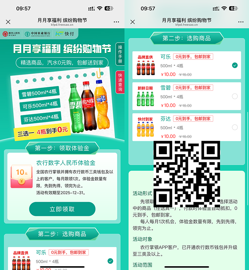 2、再复制链接到微信打开、或者微信扫描截图上二维码进去,买4瓶可乐或者饮料,用农行数字人民币付款,就是0元